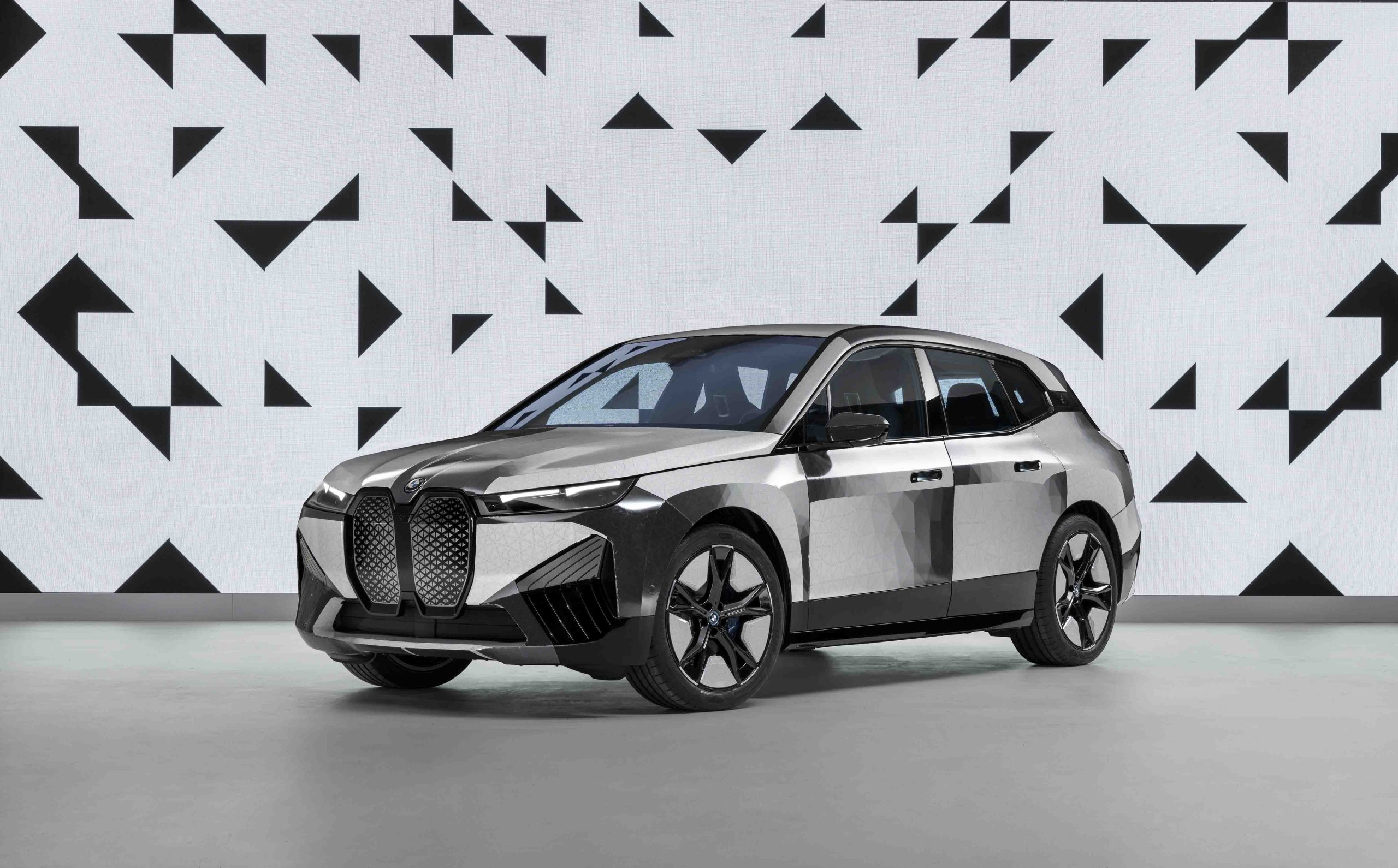 Toda la carrocería de este SUV eléctrico alemán está recubierta con una película autoadhesiva, provista de tecnología electroferética. Para entenderlo, la parte superficial de la carrocería del coche, la forman millones de minúsculas cápsulas del tamaño de un pelo humano cada una de estas cápsulas tienen pigmentos negros y pigmentos blancos con carga positiva y negativa. de modo que, al generar un campo eléctrico sobre ellos, el coche puede cambiar de color desde el blanco al negro.