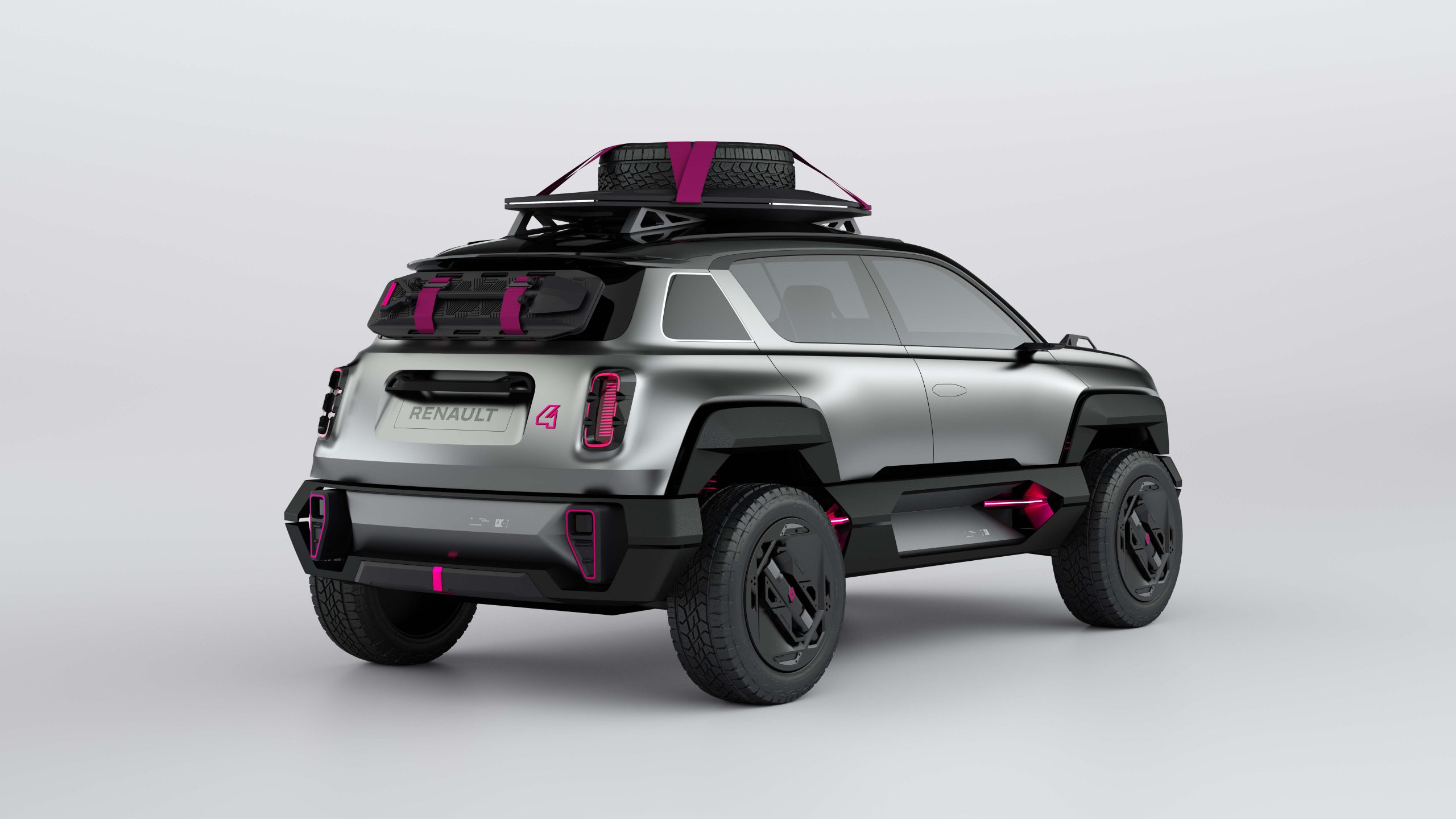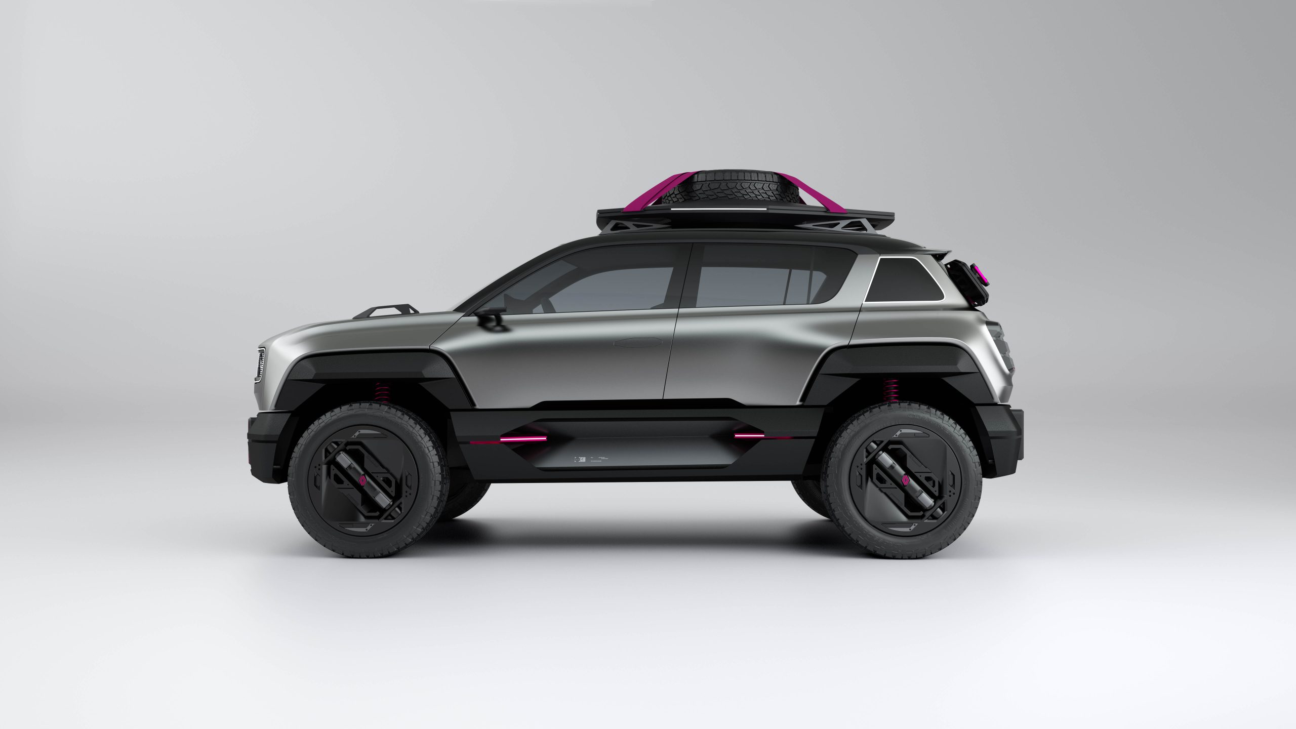 Incluso el trabajo de pintura está pensado para aquellos que buscan aventuras al aire libre. Su parte inferior está pintada en acero, mientras que su exterior propone un color plateado que se culmina con pequeños detalles en magenta, tanto en las llantas como en las cintas de la baca o en los muelles de los amortiguadores.