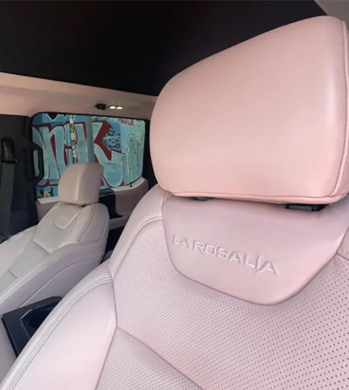 Esta 'pick-up' está personalizada al gusto de la cantante, y muestra un interior de color rosa chicle, desde el suelo hasta el techo y pasando por el volante, todo ello sin pasar por alto ningún tipo de detalle. Además, también en el interior, tiene un bordado en los asientos con el nombre de la catalana.